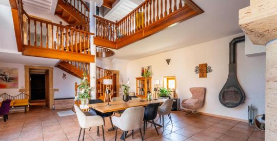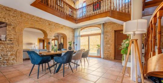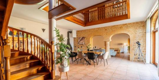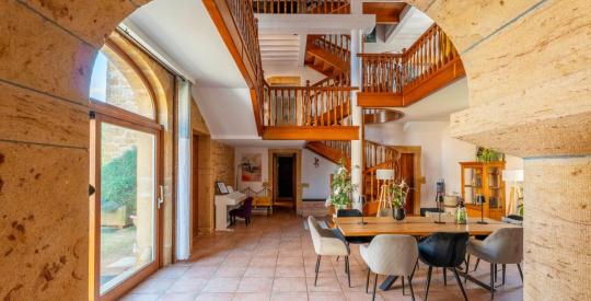 Dès l'entrée, vous serez séduit par le cachet unique de cette bâtisse. L'imposant escalier en bois massif trônant au centre de la maison donne immédiatement le ton : authenticité, noblesse des matériaux et élégance. Les murs en pierres apparentes, les arches sculptées, les poutres apparentes créent une atmosphère chaleureuse et raffinée.