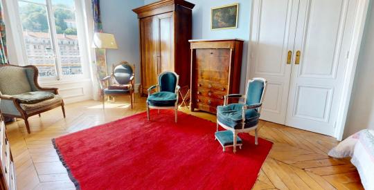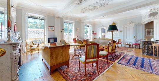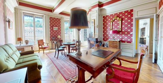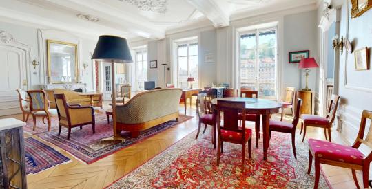 Emplacement exceptionnel pour ce superbe appartement familial de 220m2. Situé Quai Saint-Vincent au 3e étage avec ascenseur dans un très bel immeuble 19e en parfait état, cet appartement bénéficie d'une vue spectaculaire sur la Saône et la colline de Fourvière. A deux pas de l'hyper centre tout en étant en retrait de l'agitation de la ville, il est traversant, baigné de lumière et possède un cachet exceptionnel. Vous découvrirez côté quai (au sud) une magnifique pièce de vie de plus de 55m2 avec 3 fenêtres vue Saône, une superbe pièce de 30m2 pouvant faire office de bureau ou de suite parentale et une grande chambre de 23m2 avec alcôve. Coté cour au grand calme se trouvent la cuisine, 3 chambres et 2 salles de bains (à rénover). Une cave et un grand grenier sont vendus avec ce bien. Cet appartement possède également un atout considérable pour le secteur, un parking est disponible (en option). Enfin, une division peut être envisagée pour l'acquisition de 188m2 (au lieu de 218m2) à un prix moindre. Ce superbe appartement est un véritable coup de coeur de part son emplacement, sa magnifique pièce de vie, sa vue magique, la présence d'un ascenseur en étage élevé et d'un parking, et la qualité architecturale de l'immeuble.