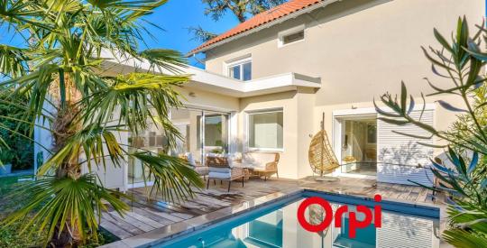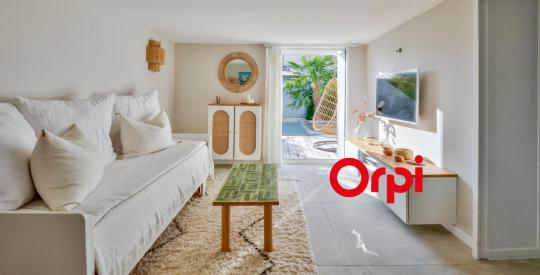 La pièce de vie, baignée de lumière, s'ouvre sur une cuisine élégante et sur l'espace piscine. Le jardin intime et clos, aménagé autour de la piscine avec volet de sécurité, promet d'agréables moments de détente en toute discrétion.