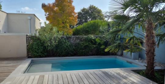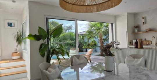 La pièce de vie, baignée de lumière, s'ouvre sur une cuisine élégante et sur l'espace piscine. Le jardin intime et clos, aménagé autour de la piscine avec volet de sécurité, promet d'agréables moments de détente en toute discrétion.