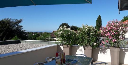 A l'étage, un superbe espace salon connecte une terrasse de 30 m² pour prolonger les espaces de vie et offre une vue dégagée sur l'environnement verdoyant.