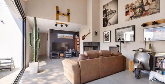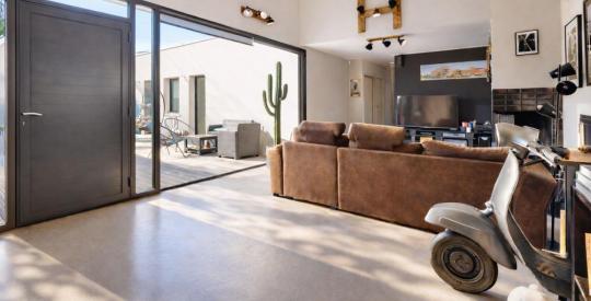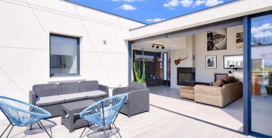 Entrée, spacieuse pièce de vie d'environ 60 m² bénéficiant d'une hauteur sous plafond de 5 mètres, avec un accès direct au patio grâce à de larges portes à galandage permettant une véritable continuité intérieur/extérieur et une extension naturelle de l'espace de réception.