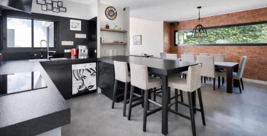 Cuisine sur mesure, entièrement aménagée et équipée, ouverte sur le séjour/salon et disposant également d'un accès à une seconde terrasse extérieure, ainsi qu'un bureau.