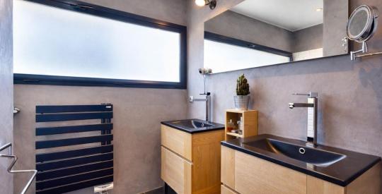 Cuisine sur mesure avec électroménager haut de gamme, intégralité des sols en béton ciré, placards et dressings sur mesure réalisés par un menuisier, chauffage au sol individuel par pompe à chaleur air/eau avec fonction rafraîchissante, cheminée, menuiseries double vitrage aluminium anti effraction, portes à galandage et baies coulissantes, portail motorisé et porte de garage électrique, VMC simple flux, isolation intérieure par les murs et le toit, fibre optique.