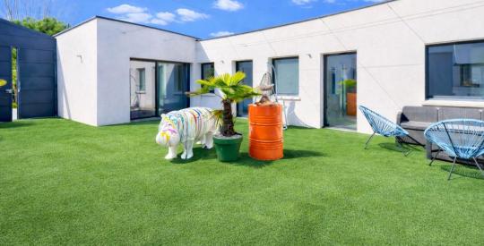 Elle développe 170 m² habitables (206 m² au total) et se compose de 7 pièces / 4 chambres dont une suite parentale et un bureau en supplément. Un garage double complète l'ensemble, le tout édifié sur un terrain entièrement clos et arboré de 1 281 m², piscinable.