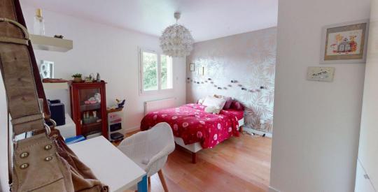 Au deuxième étage, l'espace nuit se compose de quatre chambres, dont deux avec salle d'eau privative, un bureau idéal pour le télétravail, ainsi qu'une salle de bains supplémentaire.