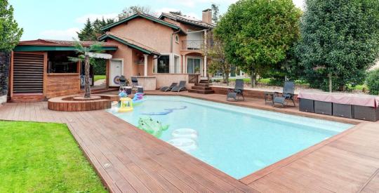 La piscine quant à elle, de plus de 12m de long et équipée d'un volet de sécurité immergé, saura vous séduire grâce à ses aménagements environnant : une terrasse périphérique en bois, un espace cuisine extérieure abritée, son poolhouse avec WC, douche et vestiaire communiquant avec la piscine intérieur, et à l'arrière de cet ensemble, vous profiterez d'un grand espace de verdure, actuellement dédié en grande partie aux plus enfants, avec des structures de jeux, des cabanes, mais aussi un terrain de pétanque pour le plus grands !