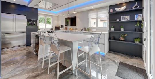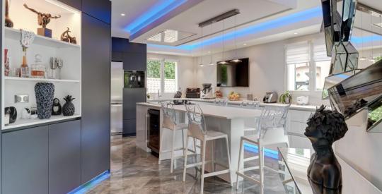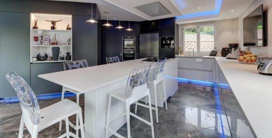 Une cuisine américaine sur mesure, signée "Côté Provence", de haute qualité, équipée d'un ensemble électroménager de marque "NEFF", le tout aménagé autour d'un îlot centrale proposant des moments plein de convivialité.
