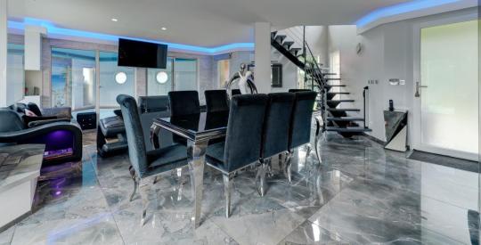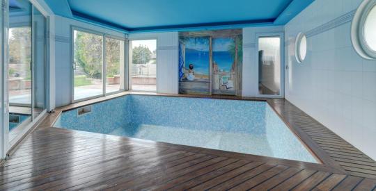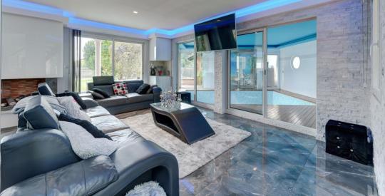 Un salon salle à manger lumineux grâce à son exposition Sud et ses multiples baies vitrées, un carrelage luxueux en pierres polies, sublimé par un mobilier chic et moderne de la marque Suisse "NATIVO", et une profondeur d'espace apportée par sa piscine intérieure, construite dans la continuité de la pièce principale, en plus de son poolhouse avec toilette, douche et vestiaire, communiquant avec la piscine extérieure.