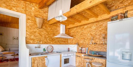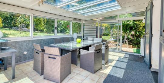 - Une grande pièce de vie cuisine semi ouverte baignée de soleil, avec cheminée insert et accès direct à la véranda et à la terrasse